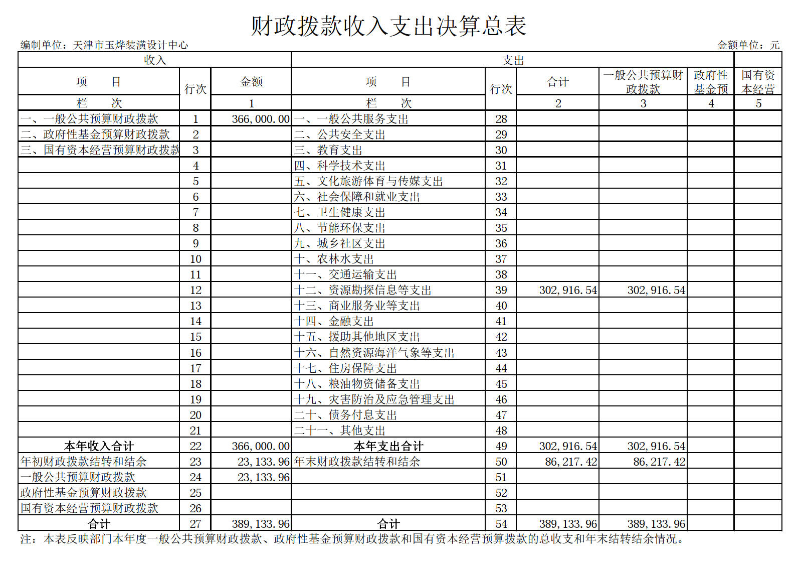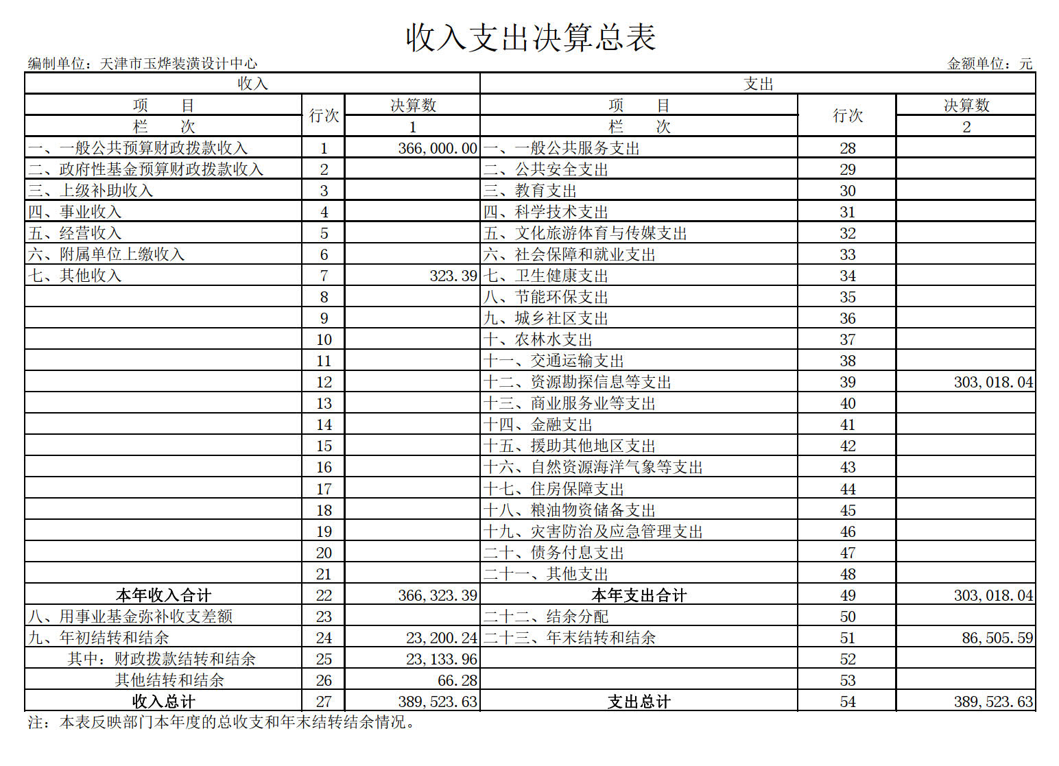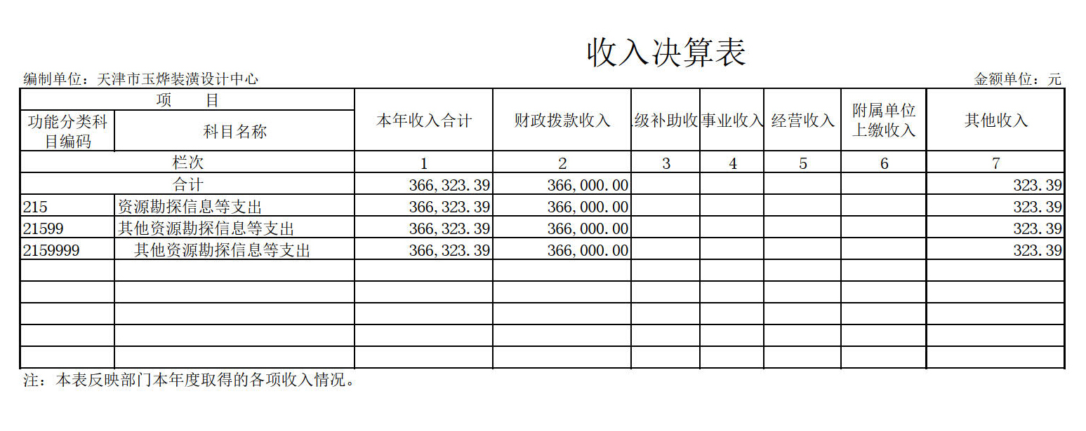 天津市玉烨装潢设计中心2019年度部门决算收入总计389,523.63元,与2018年决算相比增加2,732.35元,其中:财政拨款收入366,000.00元,占93.96%;其他收入323.39元,占0.08%。