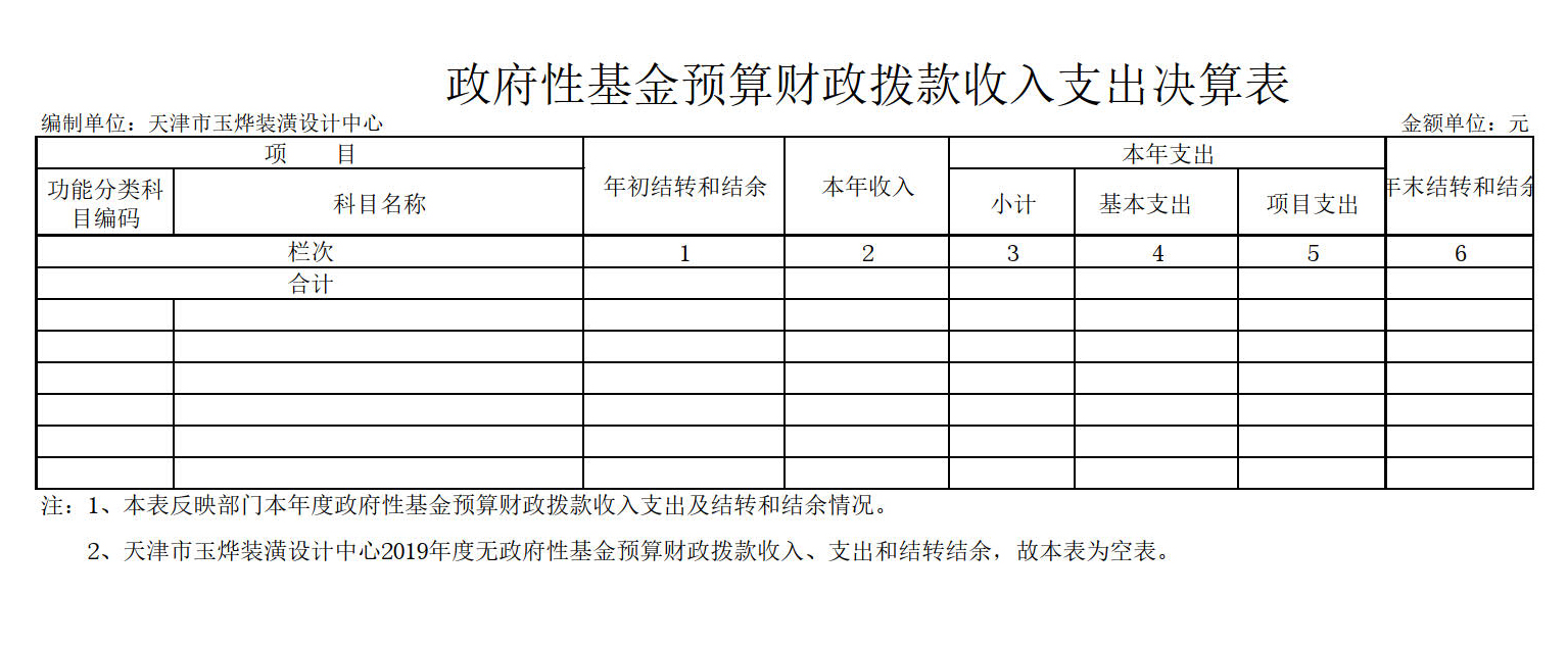 1.天津市玉烨装潢设计中心2019年度政府性基金预算财政拨款收入支出决算表为空表。
