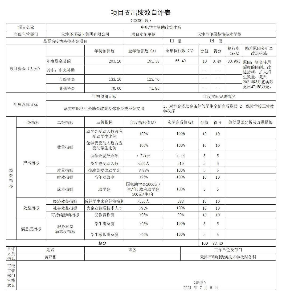 乐动官网代公开天津市印刷装潢技术学校2020年度项目支出绩效自评表